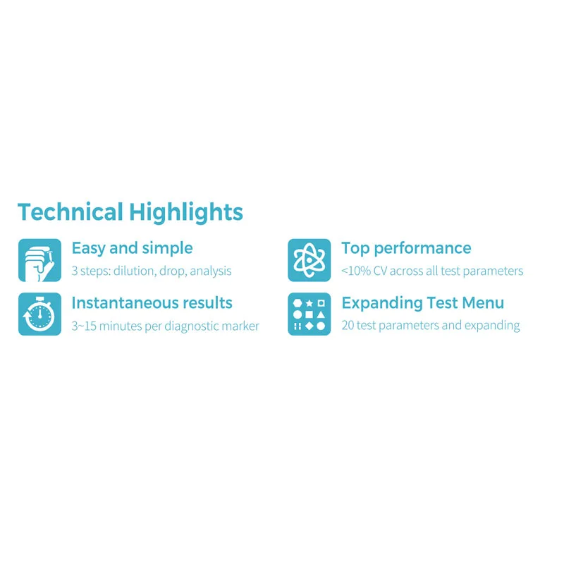 Optical Q adalah analyzer imunofluoresensi diagnostik in-vitro canggih yang secara akurat mengukur konsentrasi analit dalam darah, serum, plasma, dan sampel lainnya. Hasil pengujian dapat diperoleh dalam waktu singkat, hanya 15 menit, dengan koefisien variasi (CV) berkisar antara 5% hingga 10%.